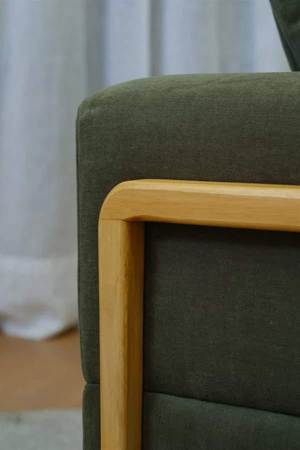 Estructura: Madera de pino gallego. Núcleo de espuma: BIOGREEN® de 42 kg de densidad con microcélulas y aceites vegetales esenciales. Cubierta: TRIAFILL de 8 cm de espesor en algodón 100%. Suspensión: Muelles ZigZag de doble curvatura y cinchas elásticas de 80 mm. Tapizado: Poliéster 100% con tecnología AQUA CLEAN para limpieza fácil y resistencia a manchas.
